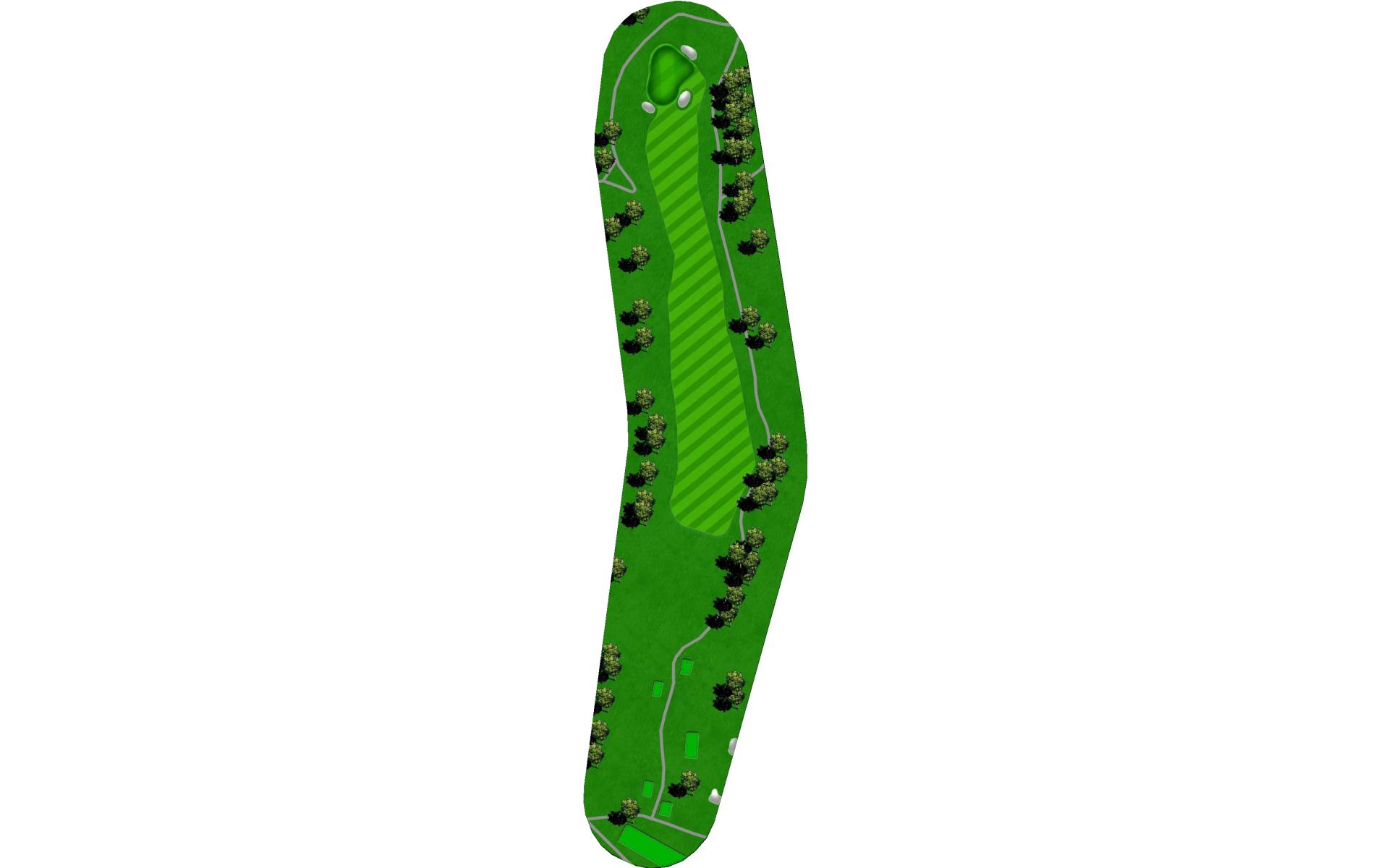 A creek runs along the left side from tee to green, and there is a pond hidden behind the bank of trees on the right. Long hitters can reach the pond off the tee. Those that hit the fairway have an easy approach to an unguarded green.