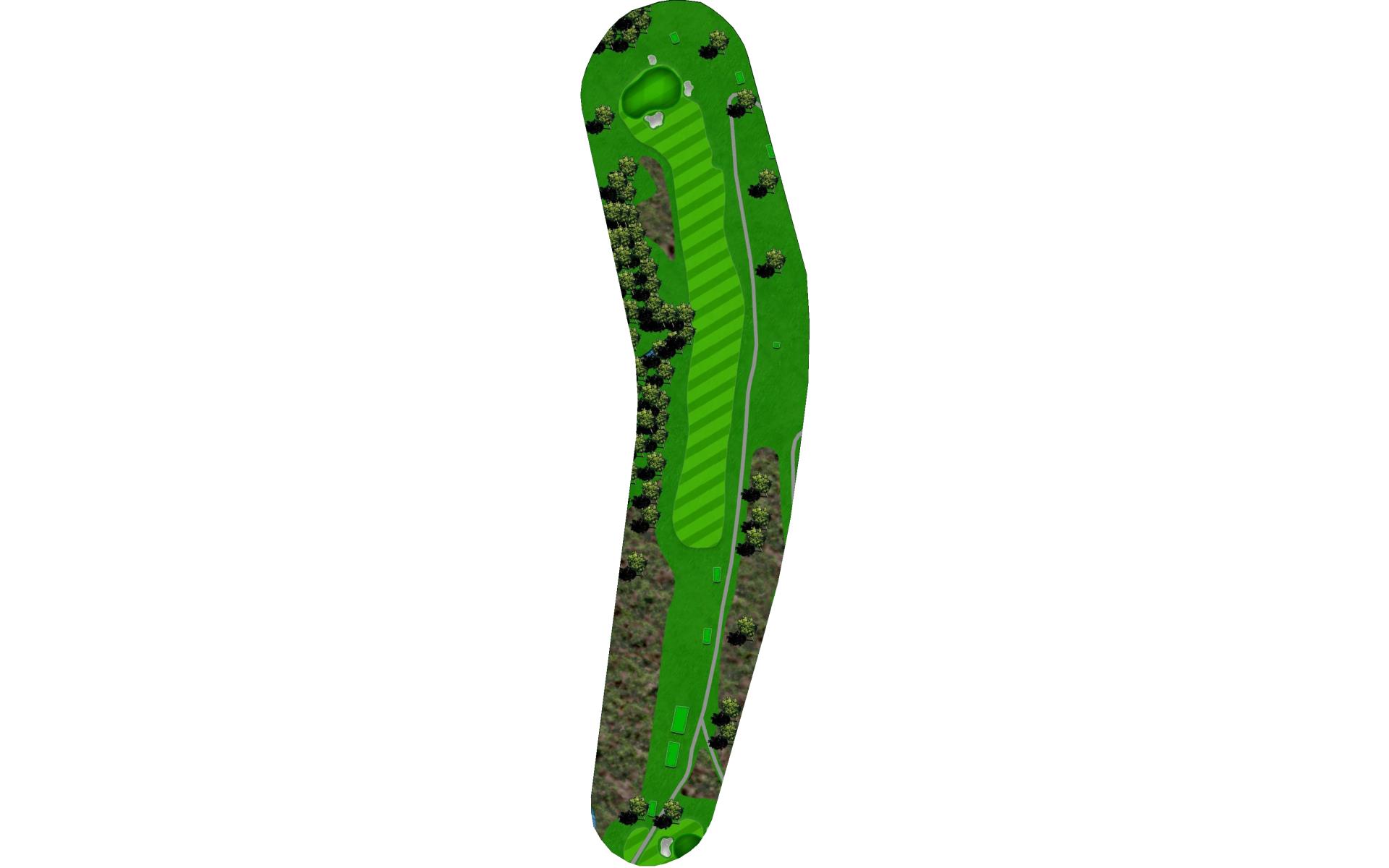 A dogleg left par 4 with OB up the left side from tee to green. The green has a ridge that cuts it in half, and slopes from left to right.