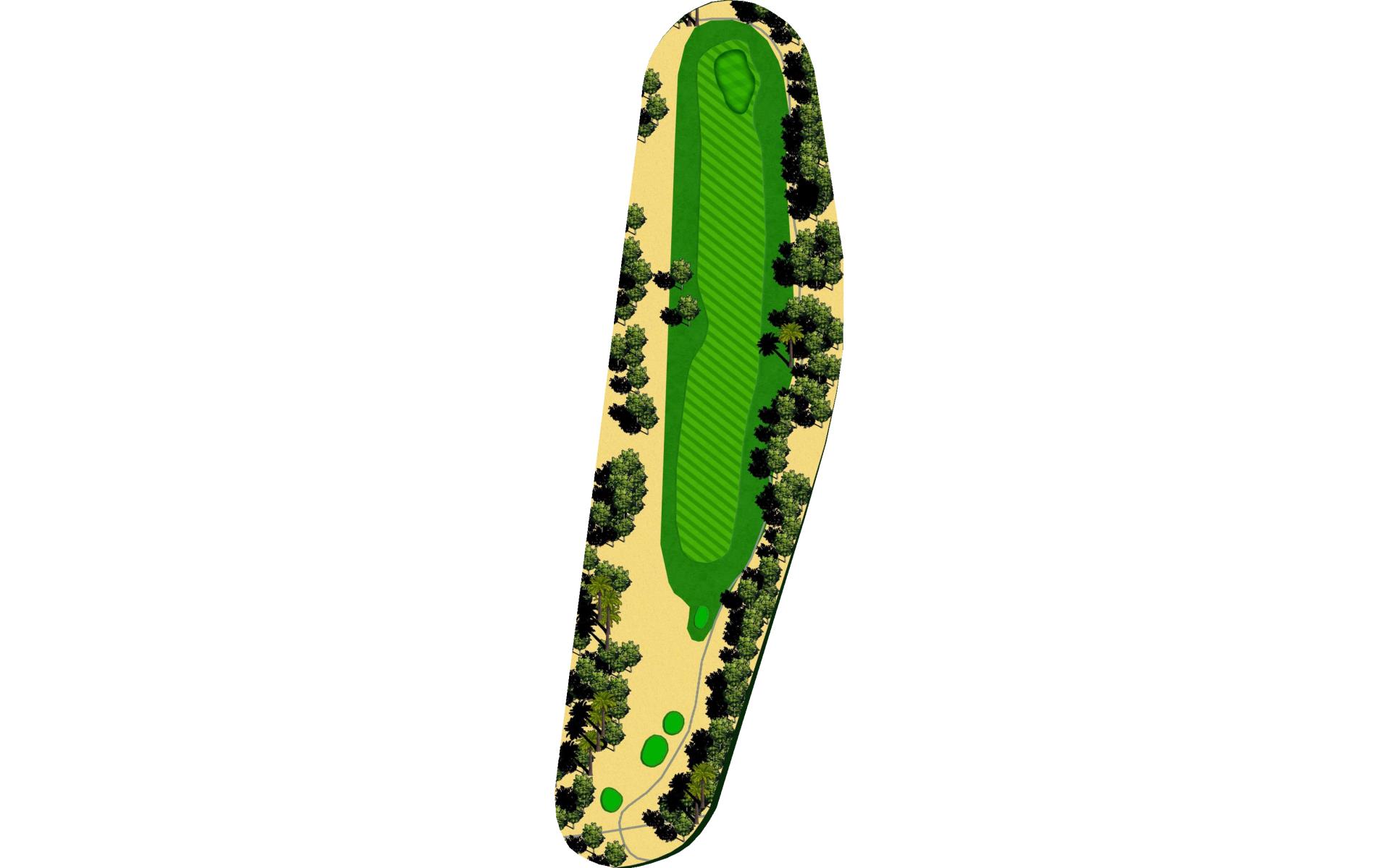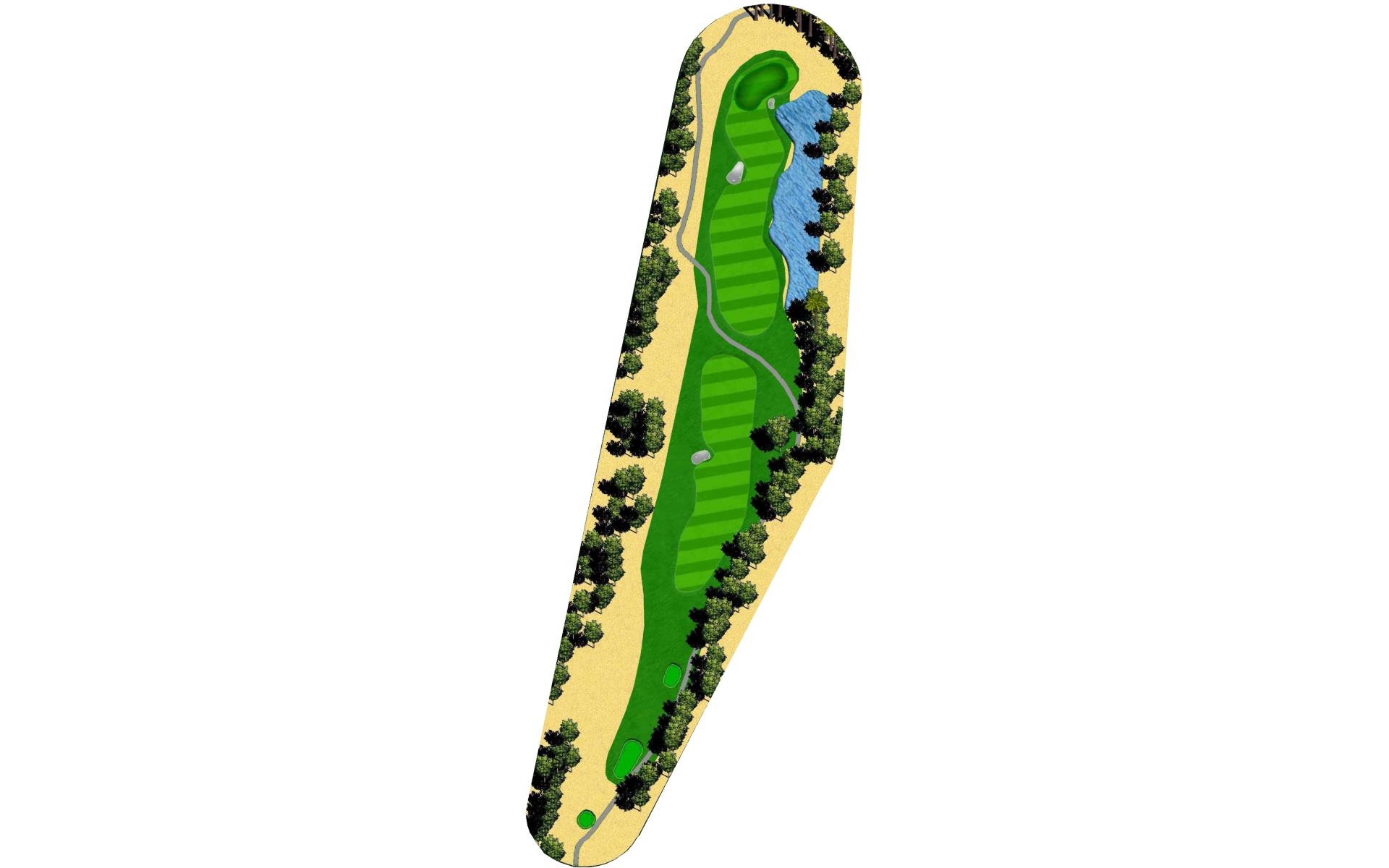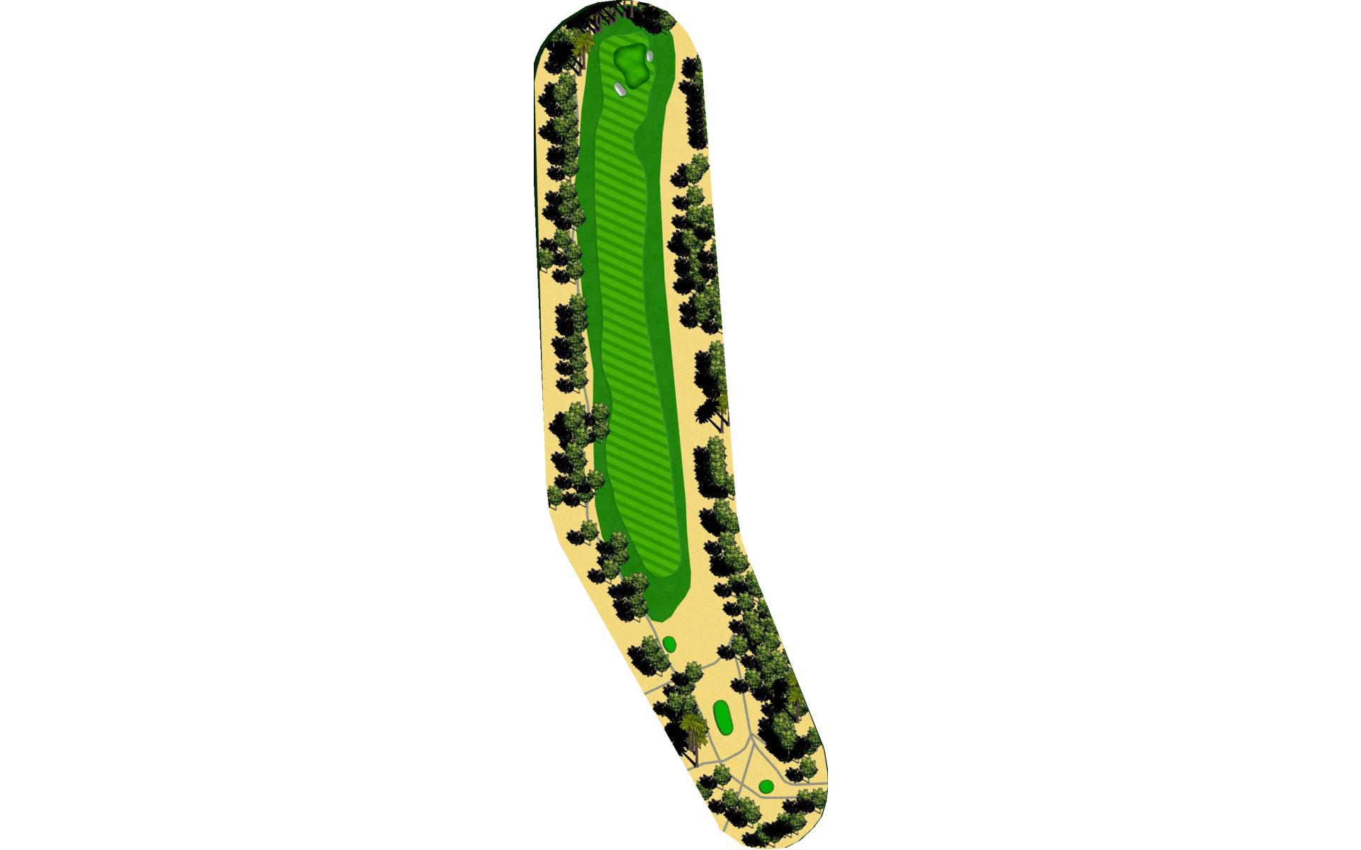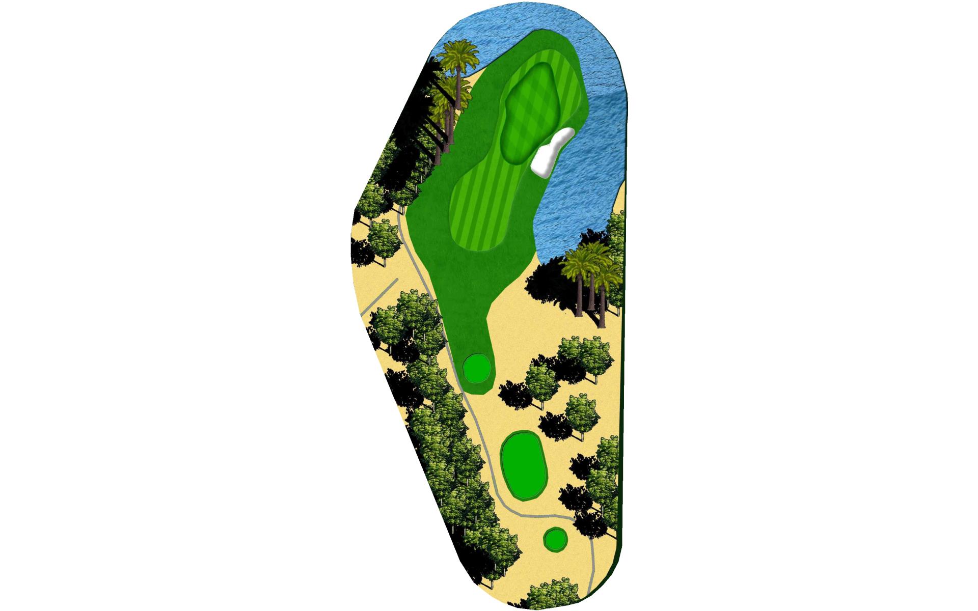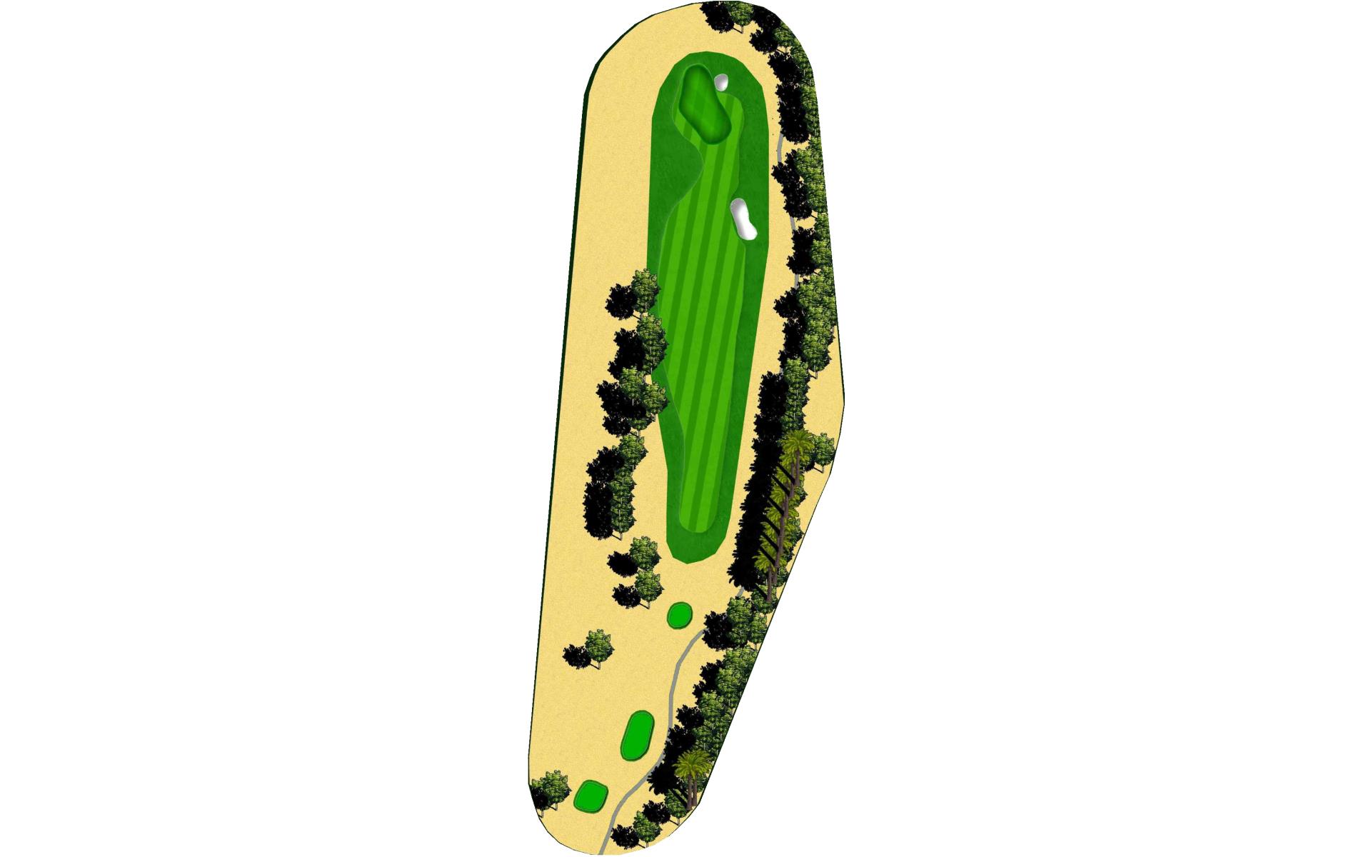 Short Par 4 that is straight away. Be careful as out of bounds runs along the entire left side of the hole and sneaks into play over the green. Fairway bunker on the right will give you approximately 160 yards into the green that is surrounded by bunkers short right and left, as well as long right. The green slopes back to front, and gets very narrow towards the back of the putting green. *Player Note: Middle of the green on approach shots to back pin placements is best.