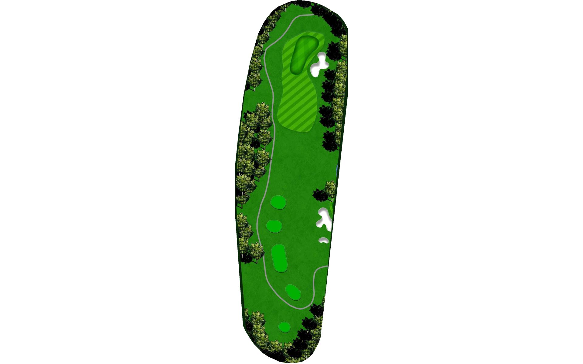 Emphasis is on a well struck tee shot to carry the wetlands. Long hitters may be able to reach the green with two big shots. The best play is to lay up just short or past the fairway bunkers lining the tiered fairway. Remember, trees and bunkers protect entry to the green from the right.