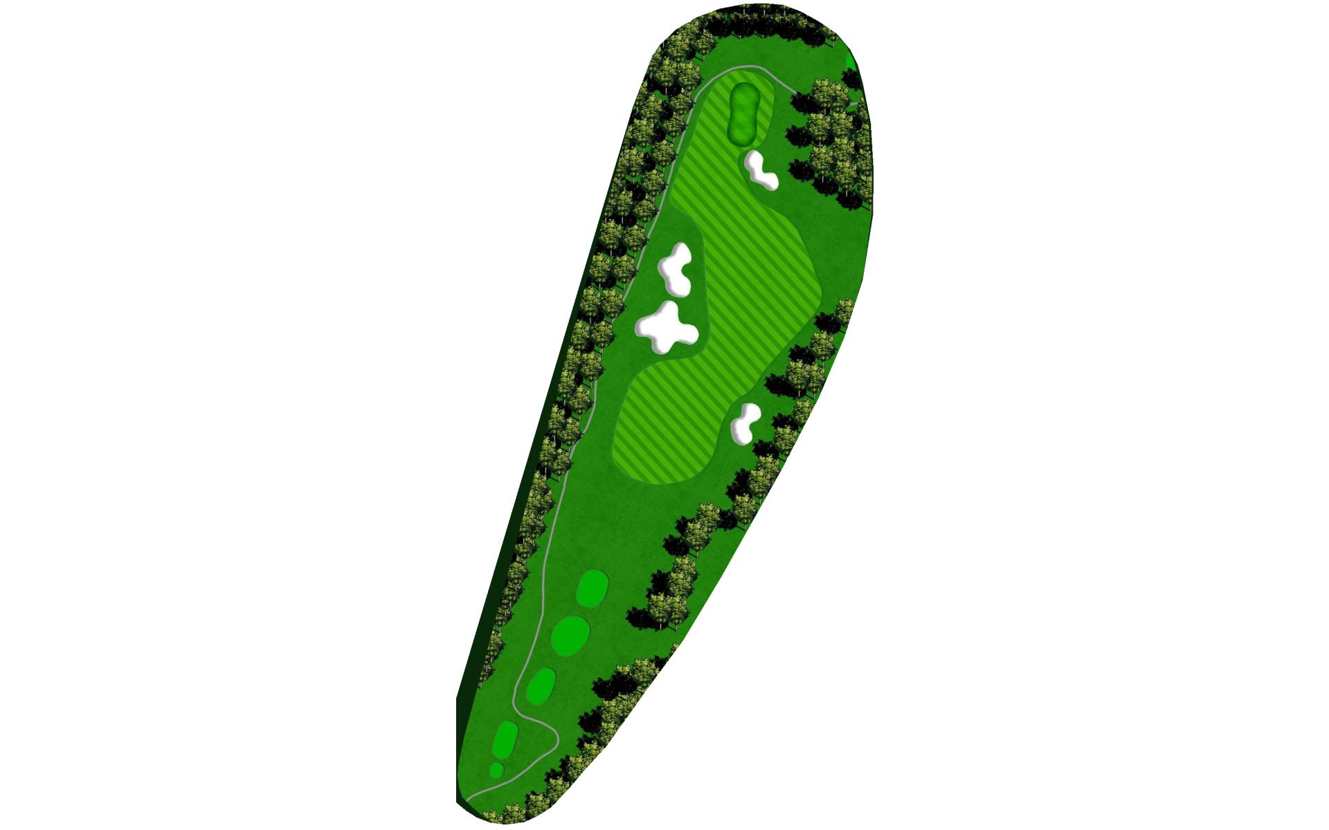 A beautiful par 3 nestled behind a small pond. The slightly elevated, extremely undulated green is well protected by green side bunkers. Anything short will end up in the pond or bunkered.