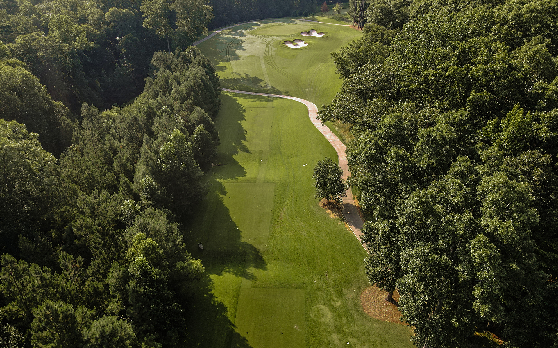 The eleventh is a slight dogleg right with fairway bunkers around the landing area off the tee. Anything down the right will be caught by the hill and result in an awkward second shot. Approach shots into the two-tiered green is downhill, where the preferred miss is short and right.